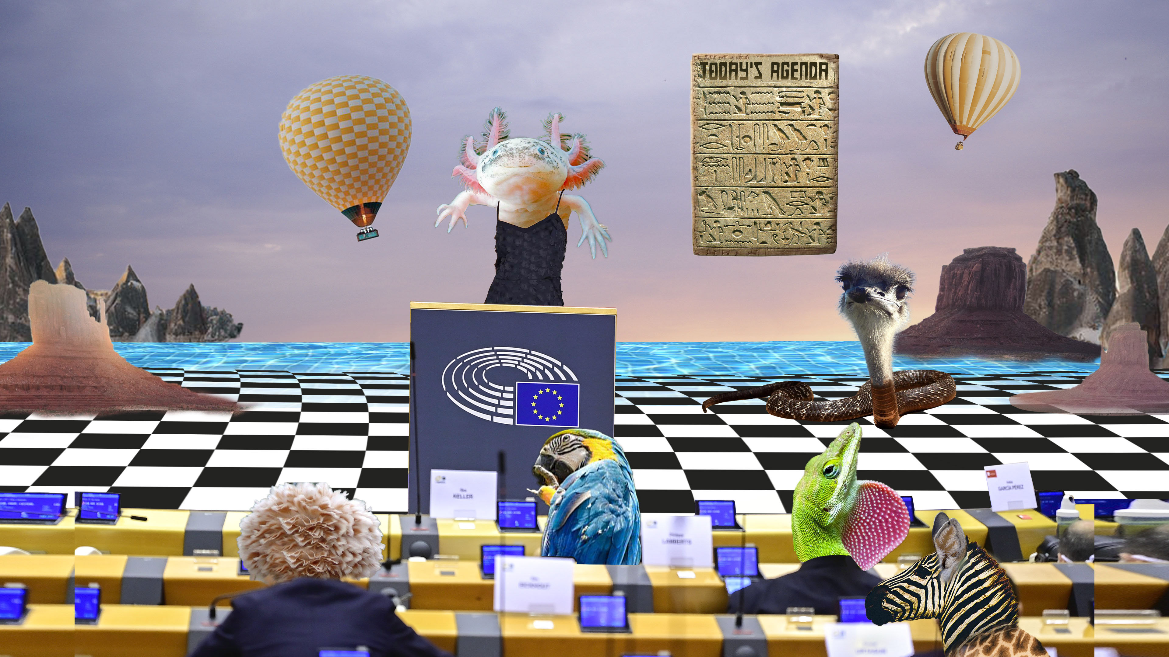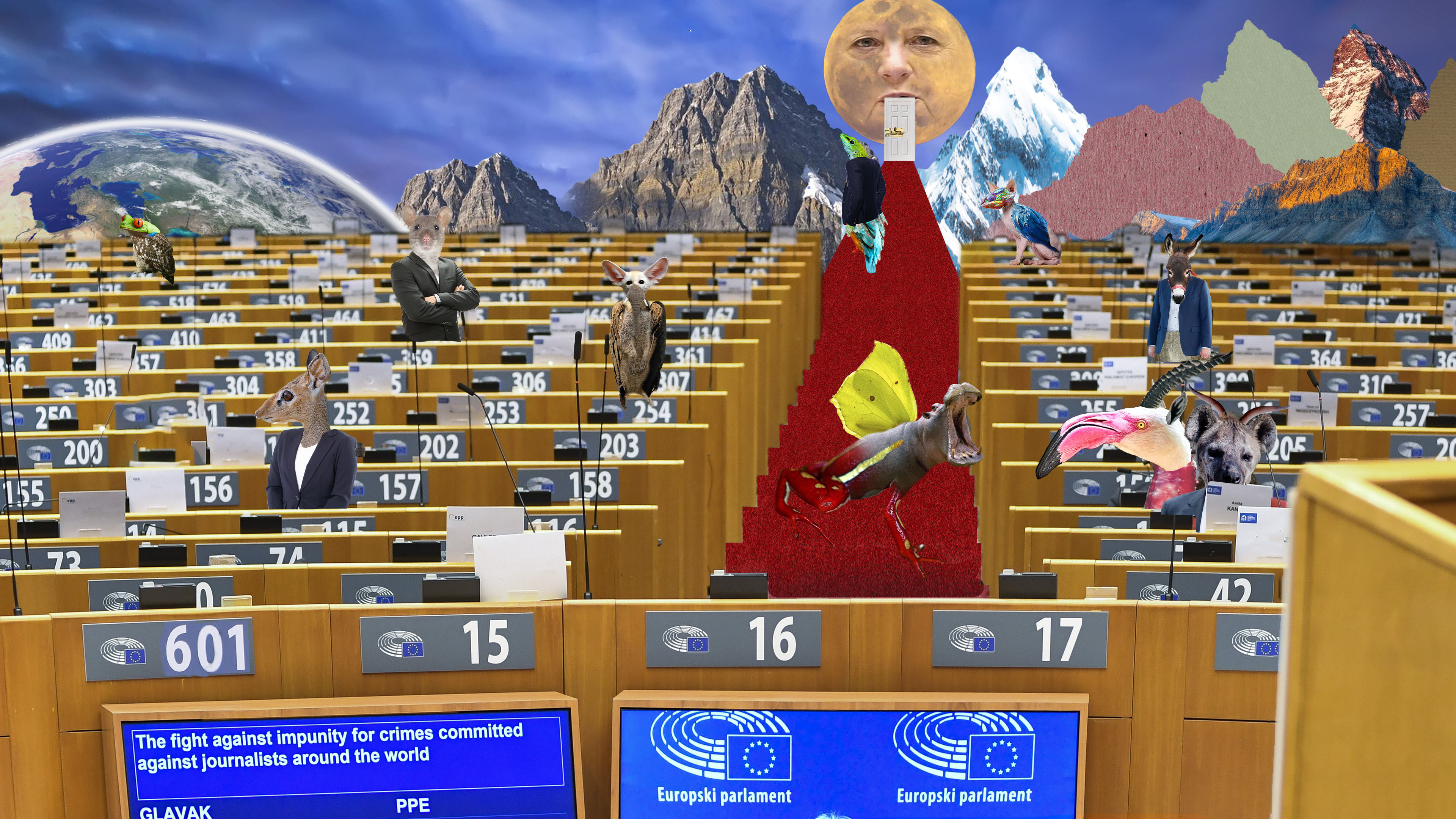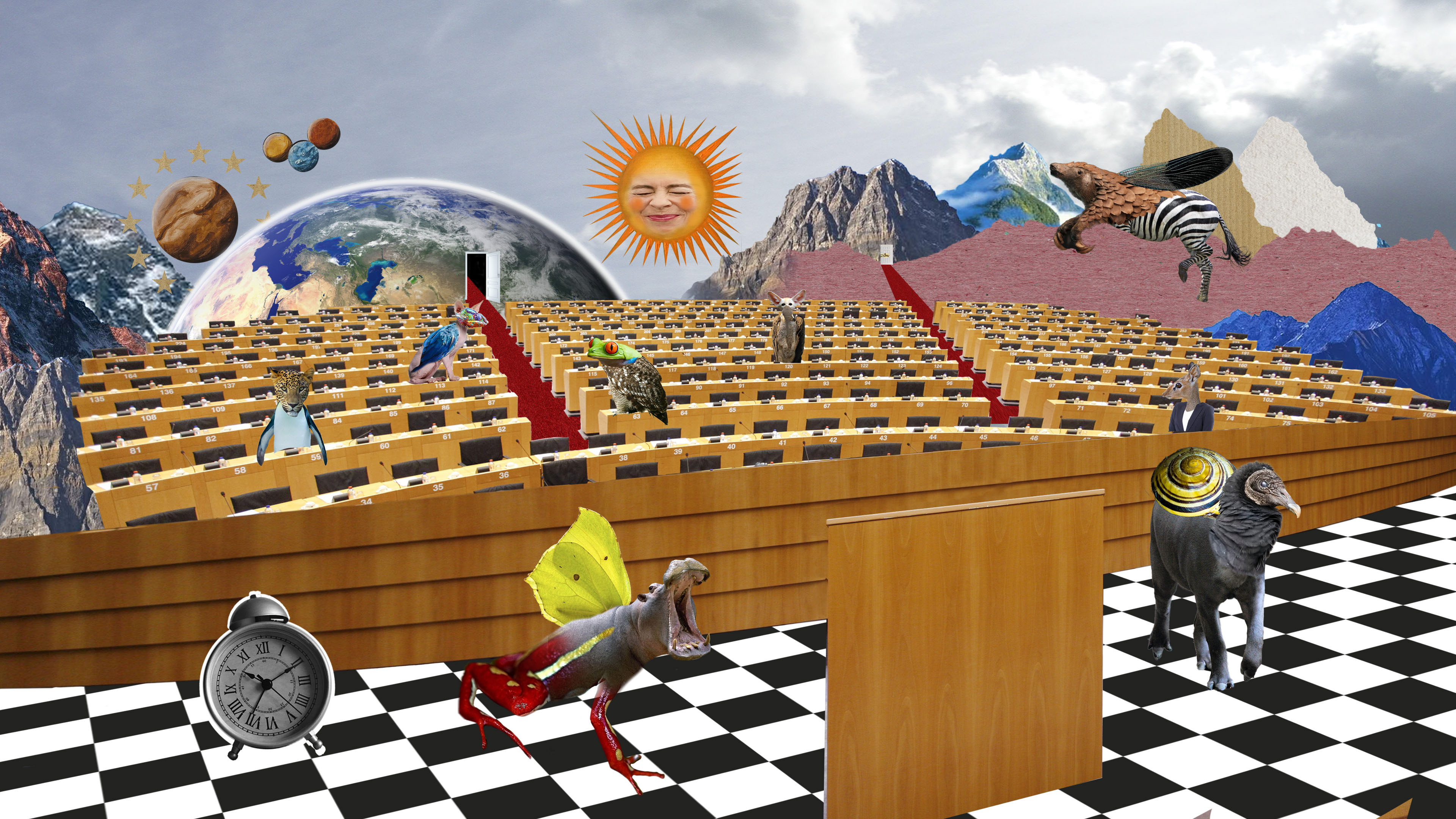 Animation Hase und Niko - Alle Tierdesign - Grafik vom Parlament, Plenar, Hasenloch, Design Europarat,